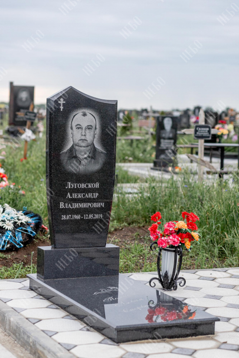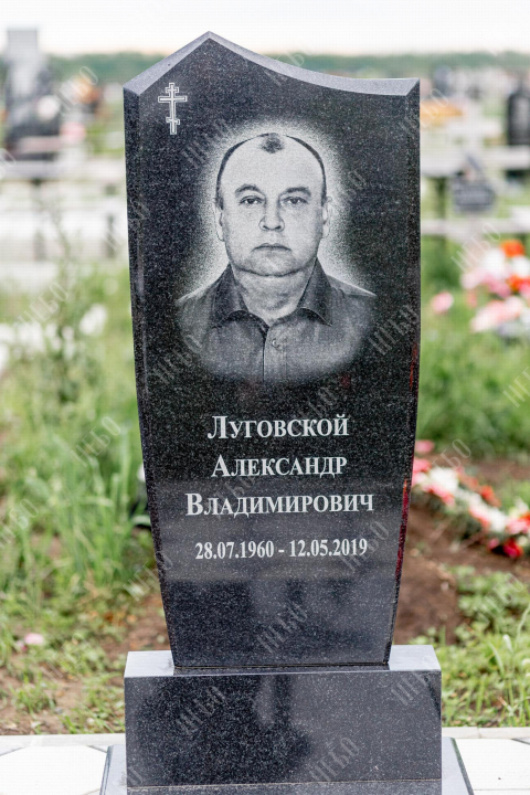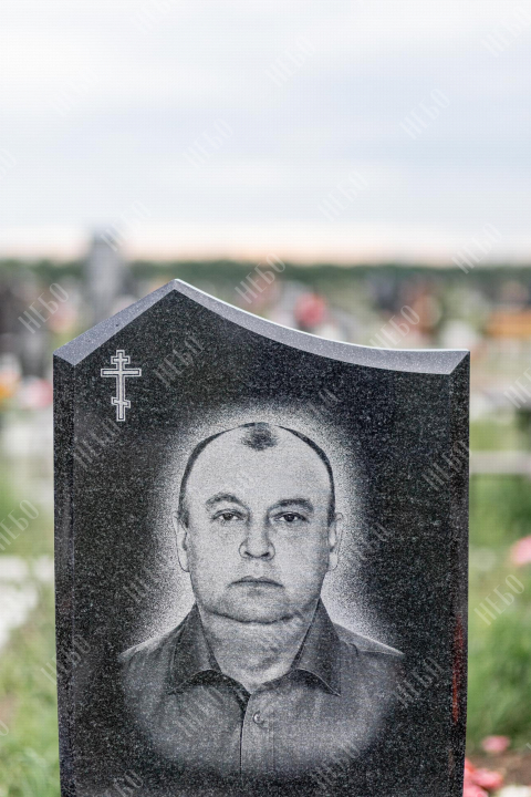Христианский памятник с вертикальной стелой и закрытым надгробием. Гранитная стела ритуального изделия имеет фигурный верх и дополнительно обработанные края по контуру. Такое исполнение придает внешнему виду памятника сдержанный, но в то же время оригинальный вид. Размер и форма памятника проработаны экспертами с учетом нагрузки и эстетического восприятия ритуального изделия. Закрытое надгробие исключает появление сорняков на поверхности, а эпитафия на плите придает памятнику завершенный внешний вид.