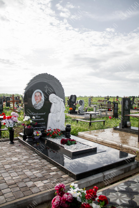 Памятник фрезерный с фигурой ангела и открытым надгробием. Использование фрезеровки в изготовлении ритуальных изделий гарантирует высочайшую точность исполнения запланированного дизайна. С помощью этой технологии в камне высекаются углубления по заданным макетам, придавая памятнику объем, позволяя комбинировать различные элементы и создавать сложные фигуры. На фрезерованном памятнике удачно контрастируют цвета и в солнечную погоду играют тени от объемных деталей. Размеры стелы и надгробия соответствуют заданным нормам при имеющейся нагрузке и исключают деформации изделия со временем.
