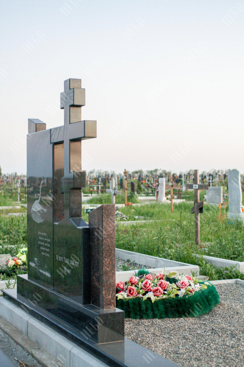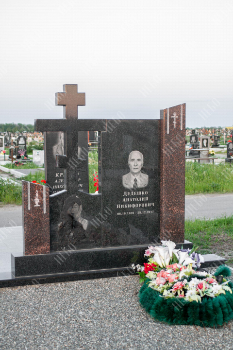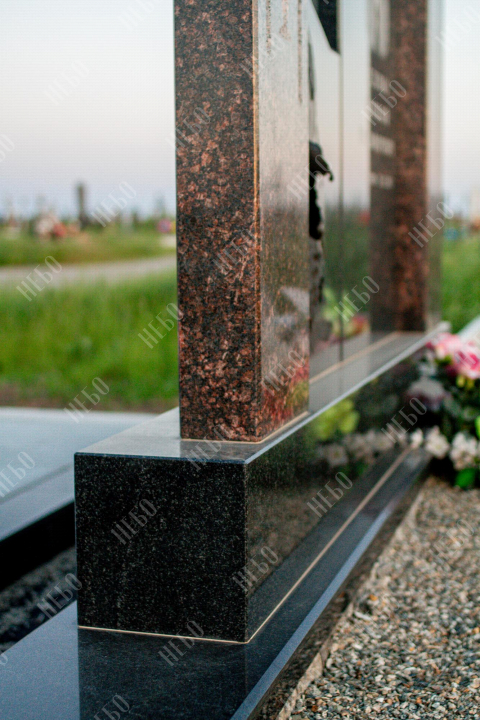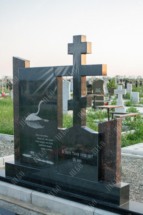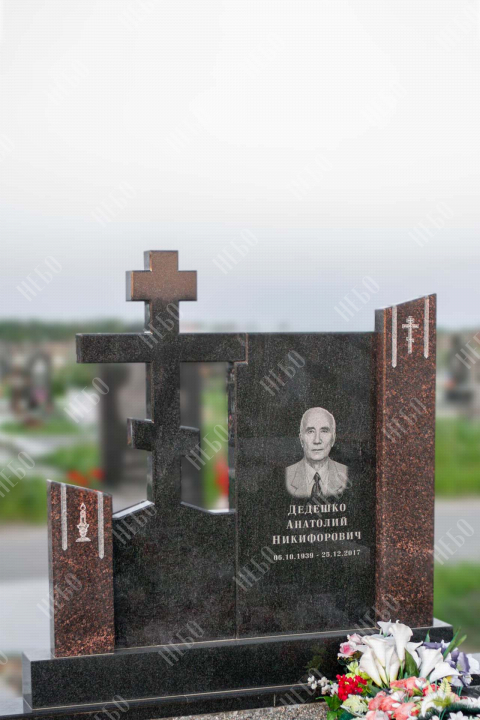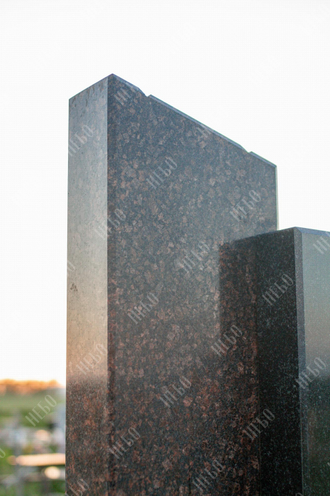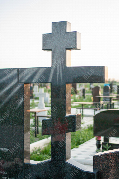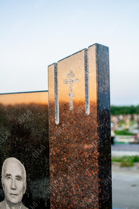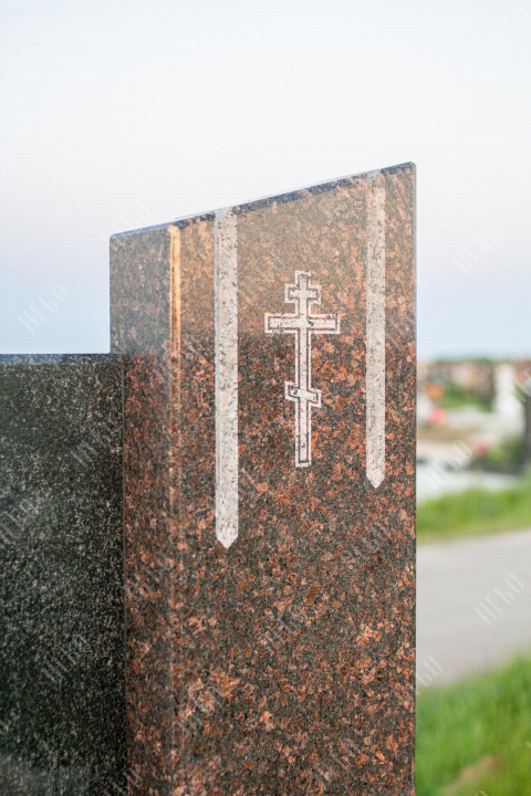 Ассиметричный памятник с крестом и колоннами. Ритуальное изделие имеет ассиметричную форму и состоит из нескольких частей, создающих единый монумент. Оригинальное сочетание составляющих памятника придает ему эксклюзивность и выделяет на фоне остальных изделий. Гранитный крест возвышается над прямоугольной стелой и двумя колоннами, приковывая к себе внимание. Колонны по обе стороны стелы имеют разную высоту и изображения креста и свечи. Размеры памятника и соотношение объемов его составляющих проработаны специалистами с учетом имеющейся нагрузки и визуального восприятия. Такой подход гарантирует долговечность и исключает искажения памятника.